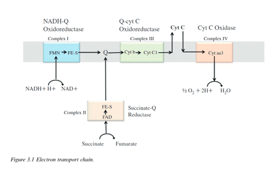 Complex I oxidizes NADH and reduces the carrier molecule ubiquinone – coenzyme Q – acting as the substrate. In a parallel process, complex II converts succinate to fumarate, also generating reduced ubiquinone. Complex III oxidizes reduced ubiquinone while reducing cytochrome b to cytochrome c. Complex IV – oxidizes cytochrome C – to cytochrome aa3. ATP-synthase uses the proton gradient created in the transport chain to energize synthesis of ATP from ADP