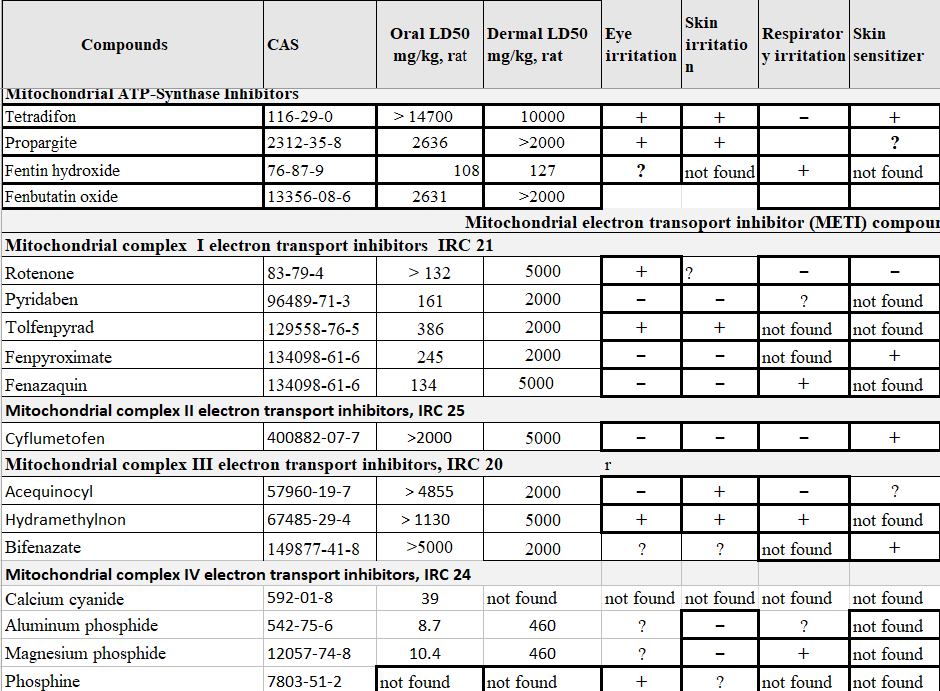 All 3 MET III complex inhibitors have low acute mammalian toxicity (Table 5). Animal tests, typically performed on concentrated technical formulations, show hydramethylonon can cause eye, skin and respiratory irritation. Data for acequinocyl and bifenazate appear less clear cut. The bait products for ant and roach control typically have AI concentrations less than 1%, so the test results on the technical may not prove relevant. The PPDB data show bifenazate as a potential dermal sensitizer, in agreement with the labeling on several products registered or previously registered in California (91234- 20-AA- 83520; 400- 508-AA- 59807; and 400- 508-ZA).