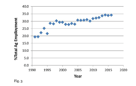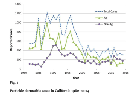 The dramatic decrease in number of dermatitis cases reported in California .corresponded with an overall decrease use of propargite. Some of the decrease could related to increases in the agricultural work force employed by labor contractors, suspected to adversely affecting illness reporting .